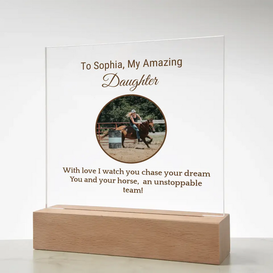 🌟 Personalized Barrel Racer Daughter's Acrylic Square Plaque: Celebrate Her Journey 🌟